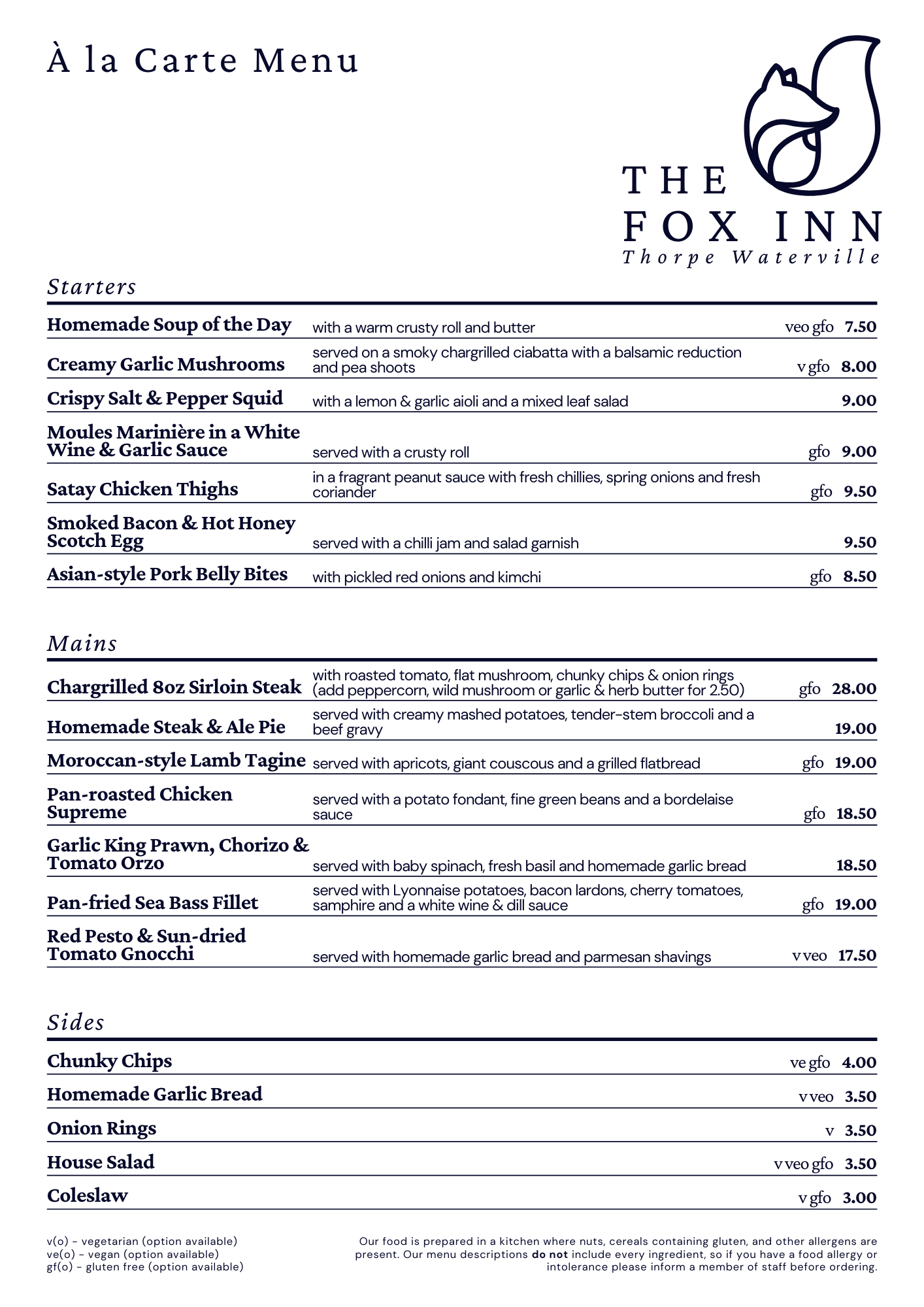 All food is cooked fresh to order, so please allow time for it to arrive. If you have any dietary issues or are unsure of anything then please ask a member of staff.
